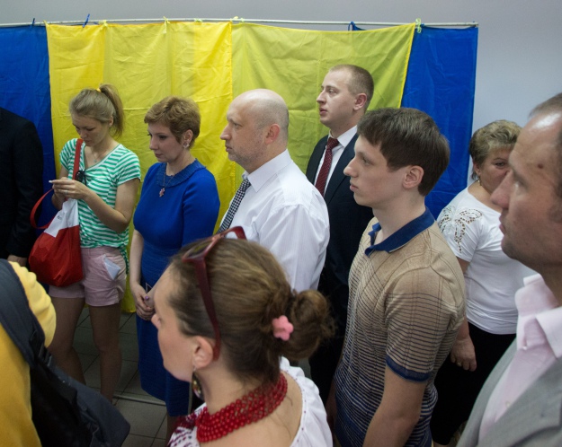 Так голосував виконувач обов'язків президента Олександр Турчинов, теж чемно стояв у черзі. Турчинов прийшов із дружиною та 21-річним сином Кирилом. Фото Михайла Марківа.