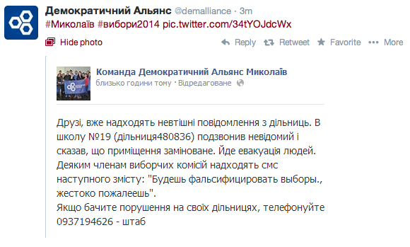 "В Александровском районе 15159 избирателей, по состоянию на 12.00 проголосовало 3410 граждан - 22,4% голосов. Это нормальная явка на выборах для Донецкой области. К сожалению, ранее выборы всегда делали представители Партии регионов, которые рисовали фиктивную явку и фальсифицировали результаты голосования. А реальный уровень голосования в Донбассе вы можете увидеть сегодня на примере нашего района. Сегодня впервые на части территории Донецкой области выборы проходят без всякого административного ресурса, давления и подкупа. Работают все 19 избирательных участков. Настроение у людей хорошее - на улицах украинская символика. Никаких сепаратистских выступлений, никаких угроз, нападений не происходит. На территории района действует местная самооборона. Обстановка спокойная, мирная. Люди очень воодушевлены, что впервые выборы проходят без насилия и беспредела. Мне кажется, организация выборов в западных районах Донецкой области - это лучшая демонстрация преимуществ жизни в демократической свободной и независимой Украине. Успехи выборов в нашем и в соседних районах дают надежду в нормализации положения во всей области. Я хочу передать благодарность всем украинцам, которые словом и делом поддерживают борьбу донетчан за свободу и единство с Украиной. Мы чувствуем поддержку соотечественников. И мы своей борьбой докажем, что Донбасс - это Украина!"