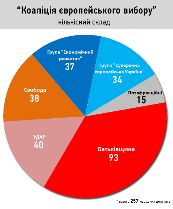 Отже "Коаліція європейського вибору" складається з 257 народних депутатів зі складу трьох фракцій (Батьківщина, УДАР та Свобода), двох парламентських груп "Економічний розвиток" (очолює Віталій Хомутинник) та "Суверенна європейська Україна" (очолює Ігор Єремеєв) та півтора десятка депутатів, що не входять в жодне парламентське об’єднання.