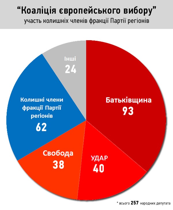 Загалом до складу нинішньої коаліції, яка підтримала постреволюційний уряд, входять 62 колишніх члена фракції Партії регіонів. Це майже чверть більшості.