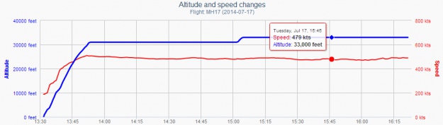 В этом утверждении правда лишь то, что самолет летел ниже предполагаемых 35 тыс. футов, а именно на высоте 33 тыс. футов. Также правда то, что украинские диспетчеры предписали ему двигаться именно на этой высоте. Однако они не снижали его, как утверждают некоторые СМИ — если взглянуть на запись полета на сайте flightradar24.com, видно, что вначале самолет шел на высоте 31 тыс. футов, а над территорией Украины поднялся до 33 тыс.