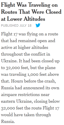 Кроме того, The New York Times со ссылкой на Евроконтроль и Федеральную авиационную администрацию пишет, что за несколько часов до взлета рейса MH17 Россия закрыла более дюжины воздушных путей на разных высотах: