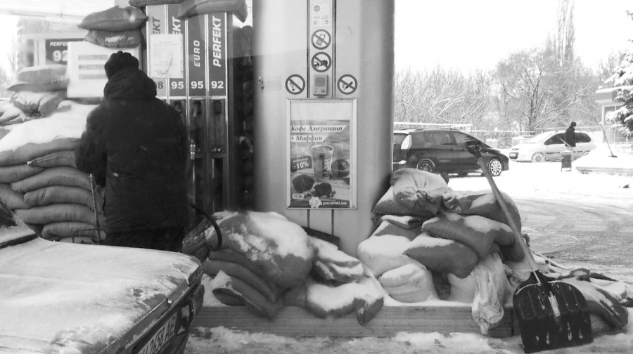 Заправки у місті працюють, от тільки обкладені мішками з піском.
