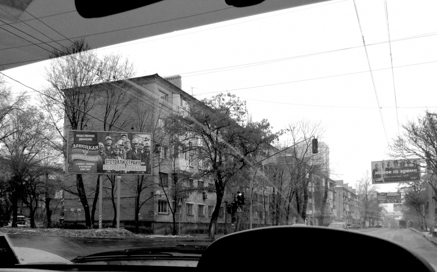 Між сотнями білбордів "во ім’я "Республіки" і зображень головного командира Захарченка, трапляється реклама журналістів "Нового времени".