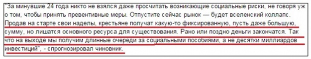 Також Максим Мартинюк вважає, що на старті за свої наділи селяни отримають якусь фіксовану, нехай навіть більшу, суму, але позбудуться основного ресурсу для існування. "Рано чи пізно гроші закінчаться. Так що на виході ми отримаємо довгі черги за соціальними допомогами, а не десятки мільярдів інвестицій", – говорить він.