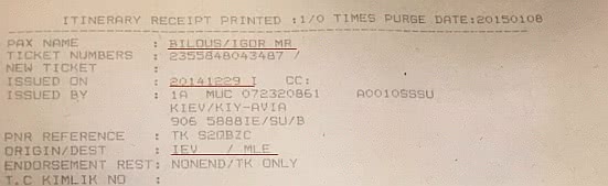 | Копія квітка на імя Ігоря Білоуса по маршруту Киів-Мальдіви. Сам Білоус каже, що ніколи туди не літав. Клікніть, щоб збільшити |