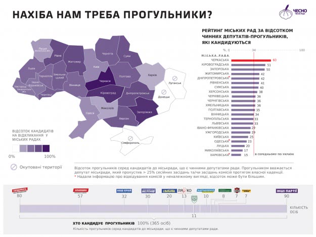 За даними аналізу ЧЕСНО, "Наш край" на третьому місці за кількістю чинних депутатів-прогульників, висунених у місцеві ради.