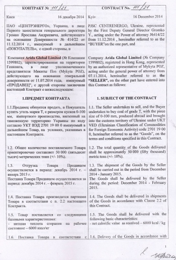 У розпорядженні редакції опинився контракт Arida Global Limited з "Центренерго" від 14 грудня 2014 року на купівлю російського вугілля. У ньому як представник Arida фігурує такий собі Микита Поз.