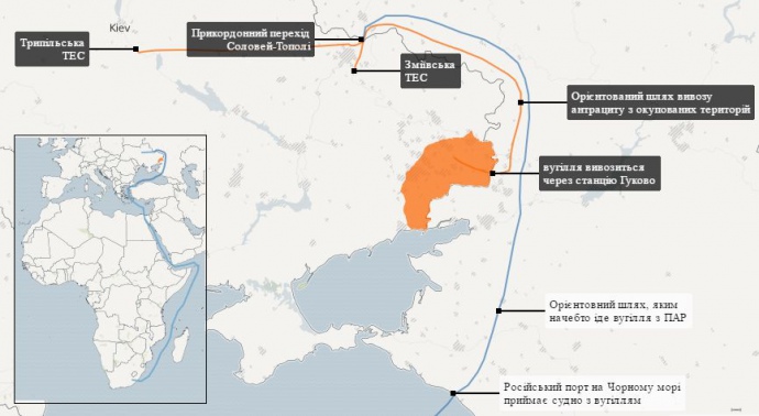 Отже, українські енергетичні держпідприємства ймовірно купують вугілля із зони АТО через російського посередника, маскуючи це під контракти на поставку південно-африканського антрациту.