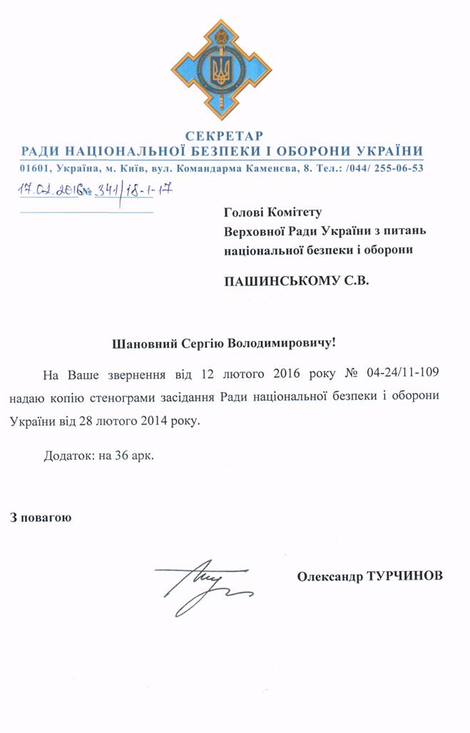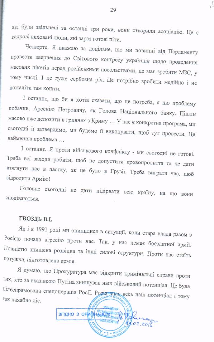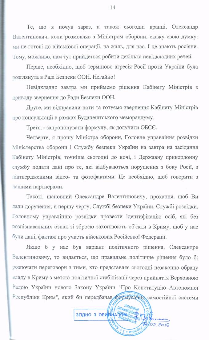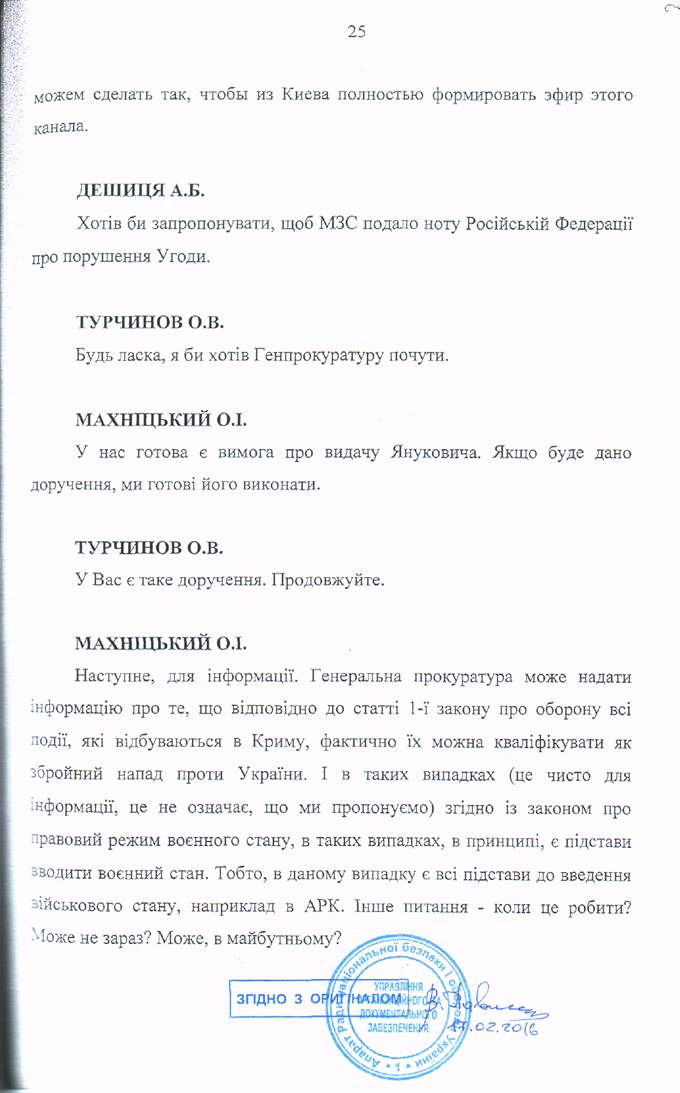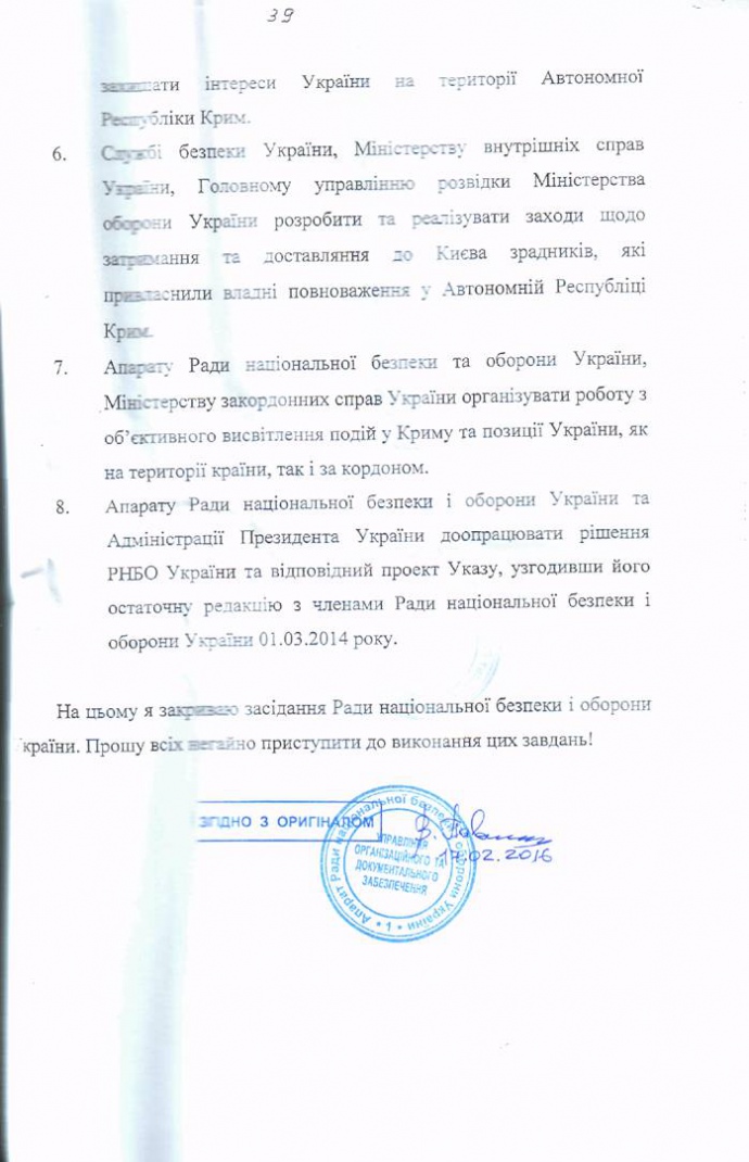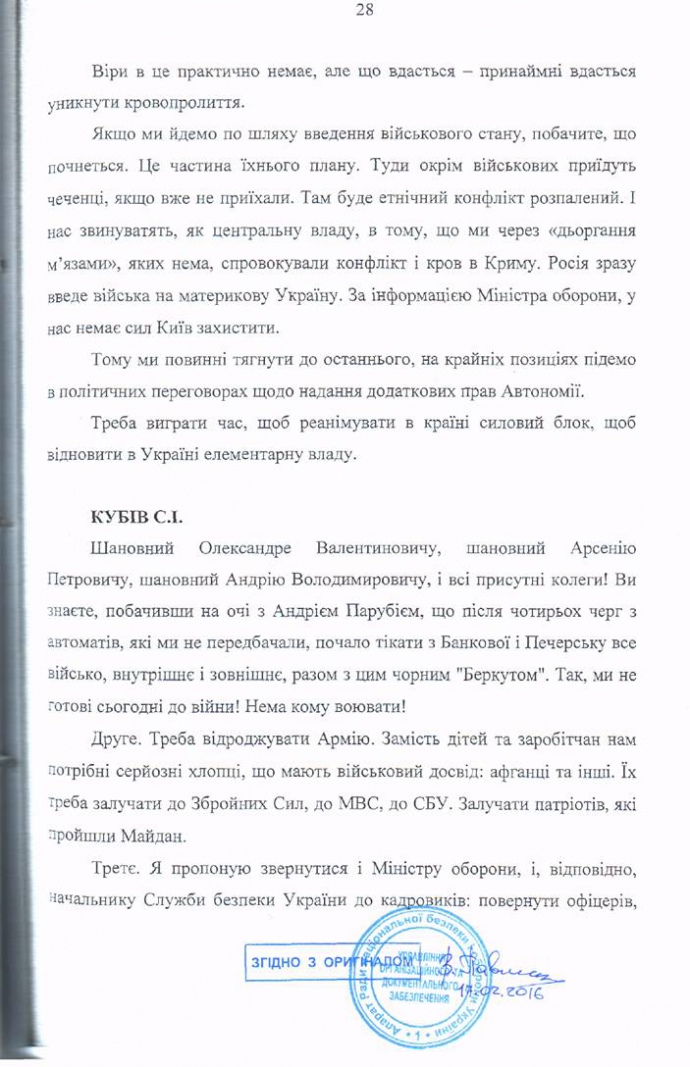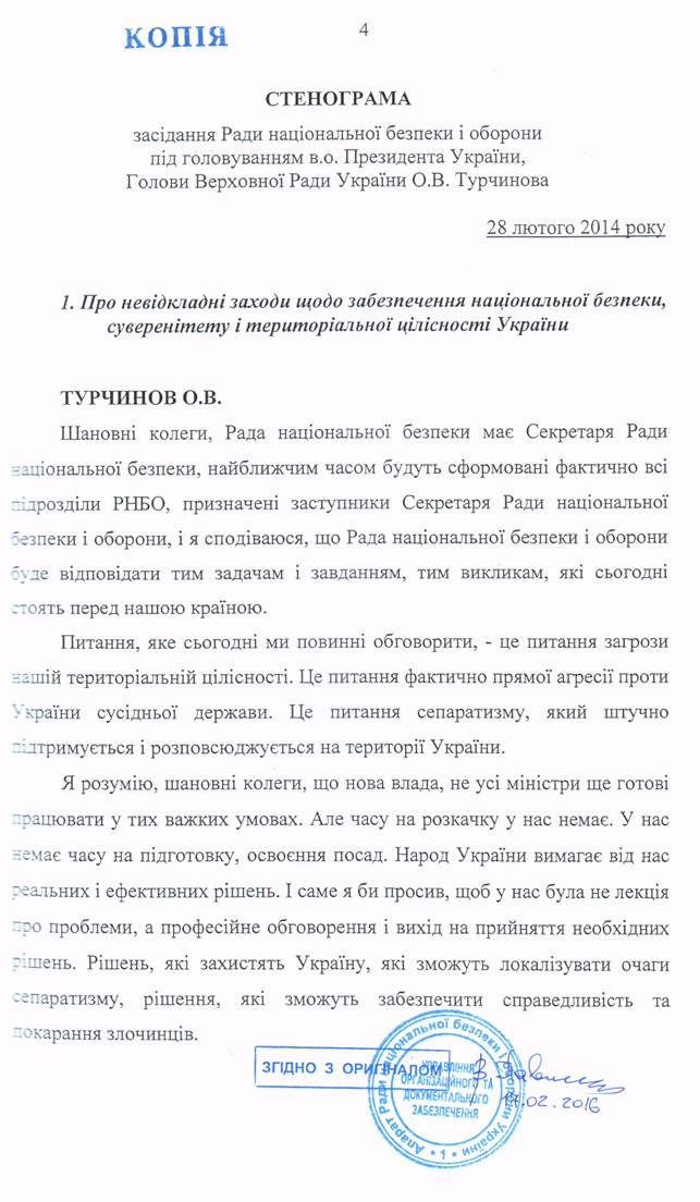 Оприлюднена стенограма засідання Ради національної безпеки і оборони від 28 лютого 2014 року, скликаного у зв'язку з початком російської агресії в Криму.