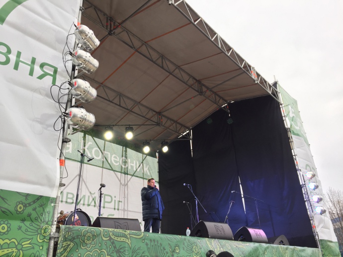 Накануне дня тишины возле того же памятника Казаку Кривой Рог – митинг. Только сцена уже брендирована символикой Укропа, митингующие держат флаги партии Игоря Коломойского, а со сцены в поддержку своего кандидата Николая Колесника выступает Борис Филатов, который осенью на выборах городского головы Днепропетровска одержал победу над Александром Вилкулом – сыном криворожского Вилкула.