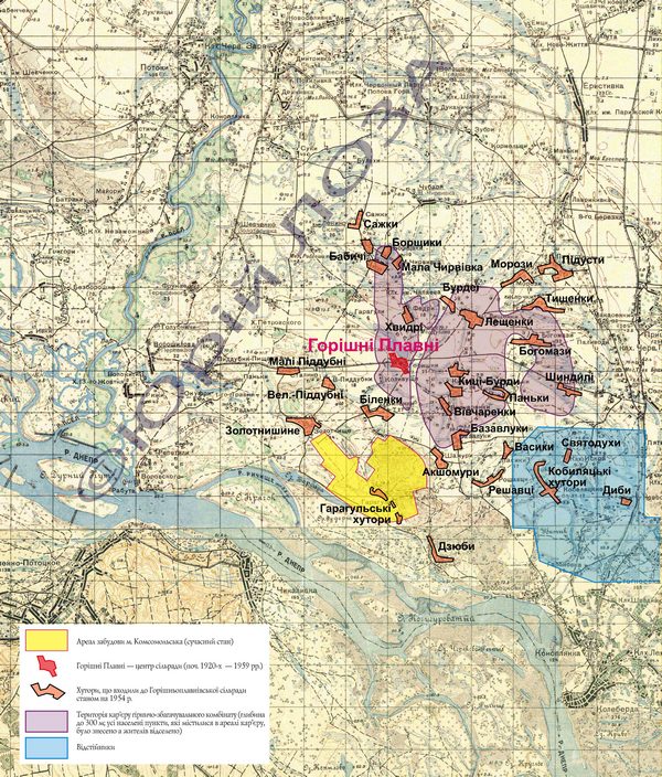 Село Горішні Плавні, яке знаходилося за три кілометри від Комсомольська, на той час уже вимирало. Згодом його територія стала частиною кар'єру Горішньо-Плавнівського родовища, де видобувають залізну руду.