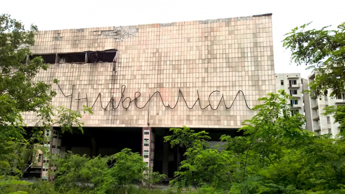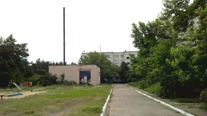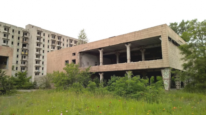 Від атомної станції по той бік траси залишилась лише височезна сіра труба, яку видно за лісом навіть із Орбіти.