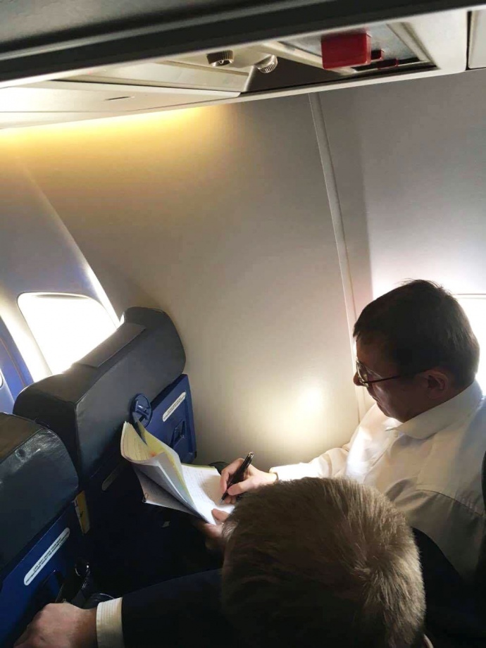 Toyota Camry едет со скоростью черепахи. Мы застряли в пробке. Луценко видит в этом плюс, есть время вникнуть в документы, дать распоряжения по областям.
