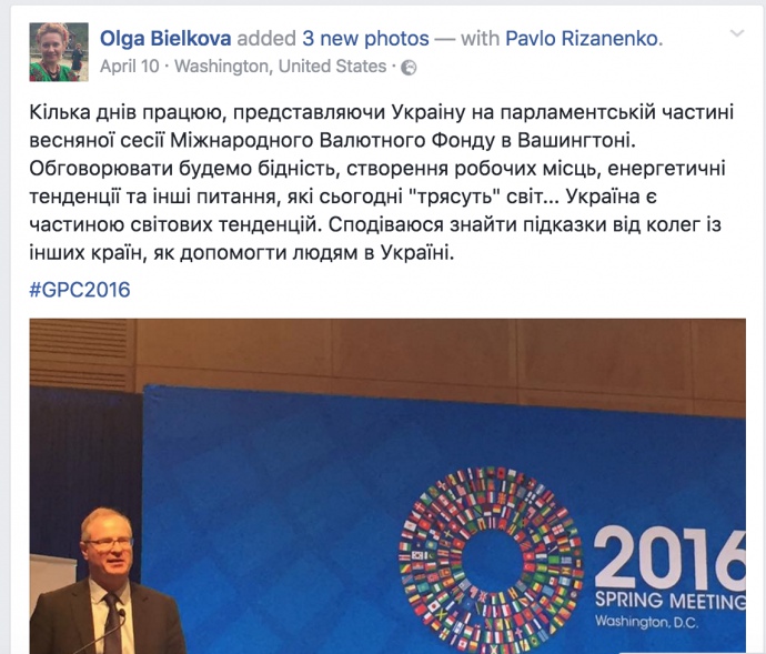 Про поїздку до США на початку квітня, у зазначені лобістами дати, депутатка фракції БПП згадує на власній facebook сторінці, щоправда, переважно у контексті Global Parliamentary Conference.