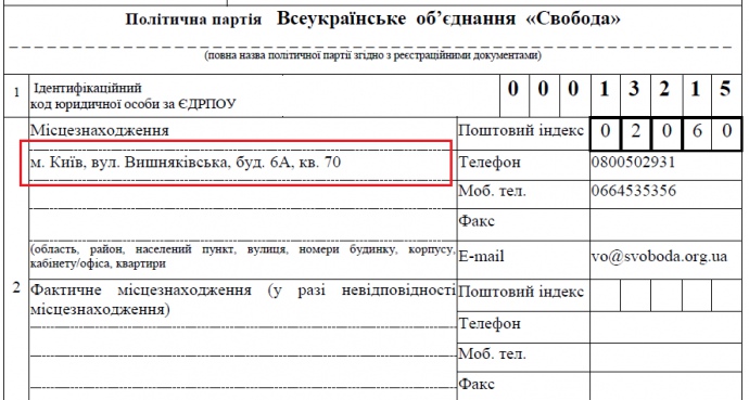 На який правах "Свобода" використовує свій київський офіс за адресою: Вишняківська, 6а, кв. 70, – невідомо.