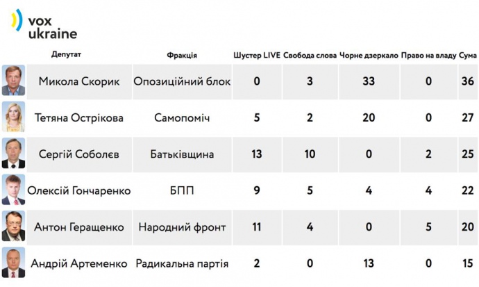 У кожної фракції є своя "балакуча голова" – людина, яка більше за всіх членів фракції ходила на ефіри. Наприклад, у БПП - Олексій Гончаренко (22 ефіри), у НФ – Антон Геращенко (20), в ОБ –Микола Скорик. Останній взагалі лідер за кількістю візитів на ток-шоу – 36 ефірів, з яких 33 депутат з ОБ провів у програмі "Чорне дзеркало". На другому місці – позафракційний Дмитро Добродомов, у якого 30 ефірів (66% "ходок" було на "Шустер LIVE"), а на третьому – Тетяна Острікова. Депутатка із "Самопомочі" відвідала 27 ефірів (74% – у "Чорному дзеркалі"). Чемпіон від "Батьківщини" Сергій Соболєв, у нього 25 ефірів.