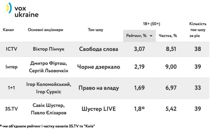 Чотири найбільш популярних – "Чорне дзеркало" (Інтер), "Шустер LIVE" (виходило у 2016-му на каналах 3s.tv та Київ), "Свобода слова" (ICTV), "Право на владу" (1+1). За минулий рік ці програми виходили у прямий ефір 149 разів.