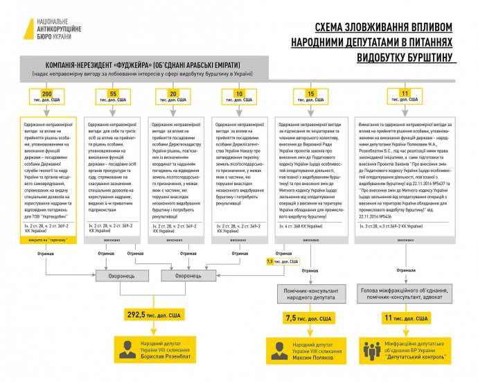 "Поляков довів до відома Розенблата Б.С., що ним спільно з представниками міжфракційного депутатського об’єднання "Депутатський контроль" в інтересах компанії "Фуджейра", представником якої є Сивокінь К.С., опрацьовується можливість внесення змін до проекту закону "Про видобування та реалізацію бурштину"; змін до Податкового кодексу України щодо зменшення рентної плати за користування надрами для видобування бурштину з 25% до 5%; зміни до Митного кодексу України щодо тимчасового, до 01.01.2020, звільнення від оподаткування ввізним митом операції з ввезення на територію України обладнання, що залучається в якості інвестицій та використовується для потреб організації промислового видобутку бурштину", – йдеться у поданні.