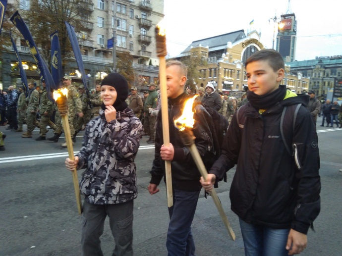 То, что мальчики становятся первыми, вряд ли случайно. Взрослые патриоты помогают журналистам отойти аккуратно в сторону, и фотографировать юных националистов, сколько им вздумается. В этот момент вспоминаются слова Тягнибока, сказанные с трибуны часом ранее: "Не посрамим память наших героев, защитим будущее наших детей – вот лозунг сегодняшнего праздника".