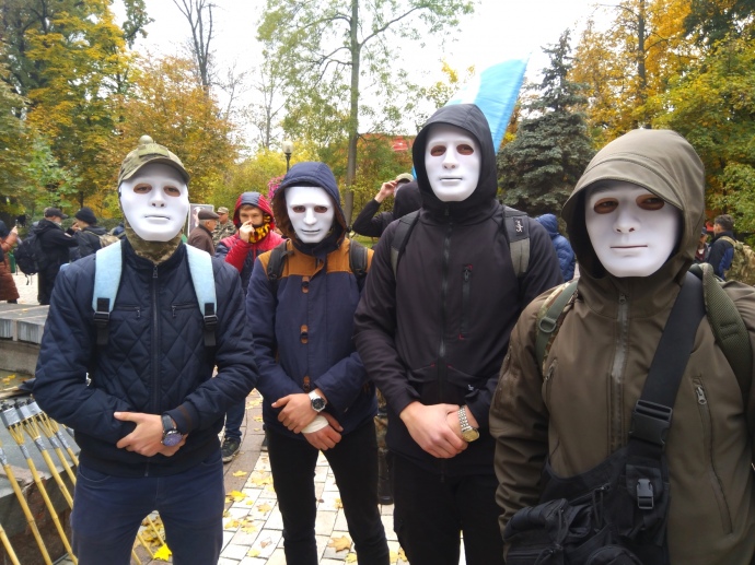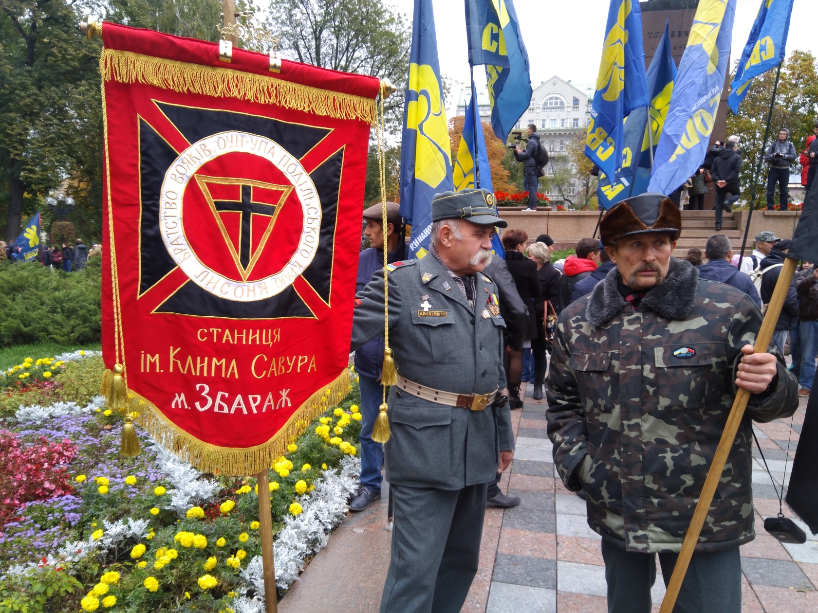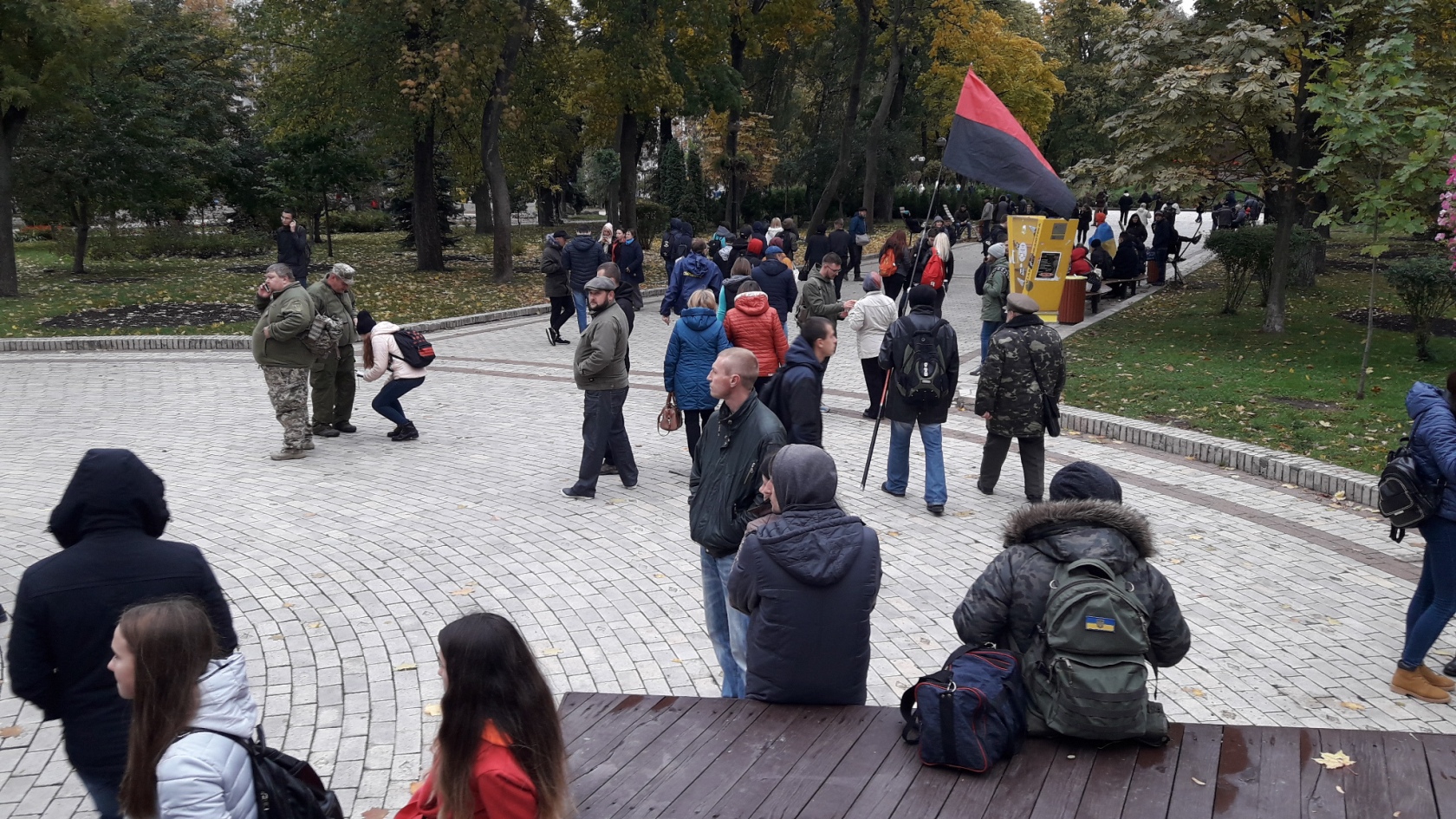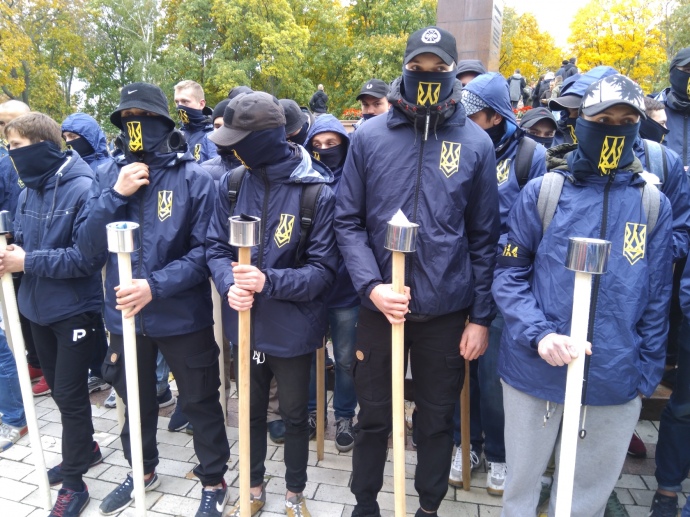 Приехавшие в центр Киева из регионов растворяются в толпе людей с разной символикой. Заметней всех – представители "Национального корпуса" и "Свободы". Их дополняют члены "Правого сектора", ОУН, КУН и С14.