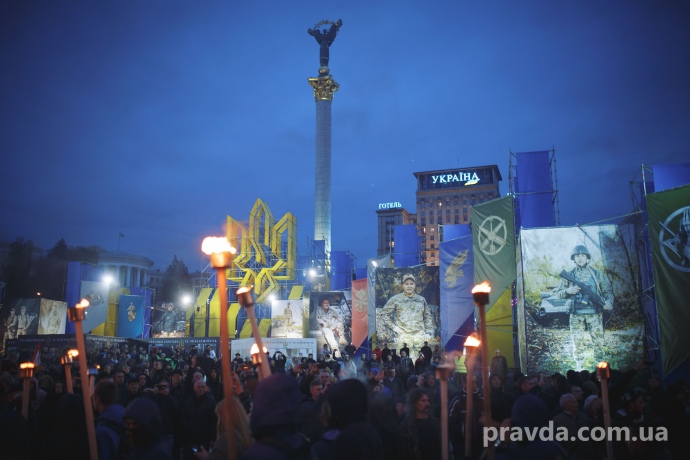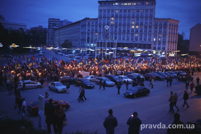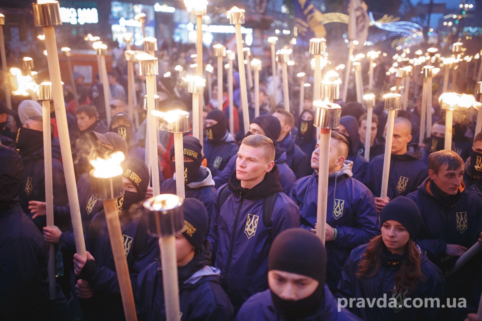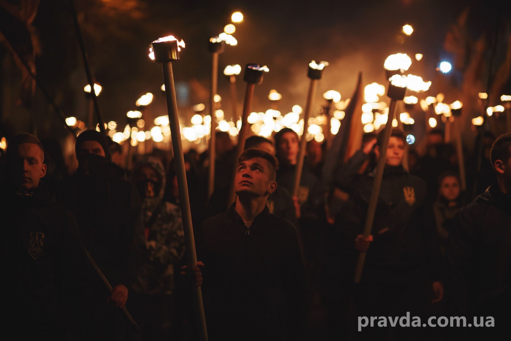 Он стал рекордным по количеству участников за последние 12 лет. Представители "Свободы", "Национального корпуса", "Правого сектора", ОУН, КУН и С14 прошлись с факелами по центральной части Киева – от парка Шевченко до Контрактовой площади (около 5 километров – УП).