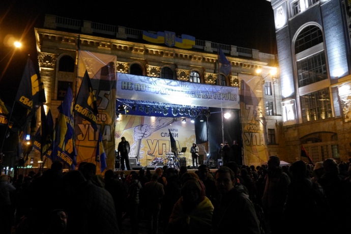 Тягнибок и его соратники продолжают озвучивать в микрофон достижения националистов. Среди них: официальный статус праздника 14 октября, а также переименование улиц и проспектов.
