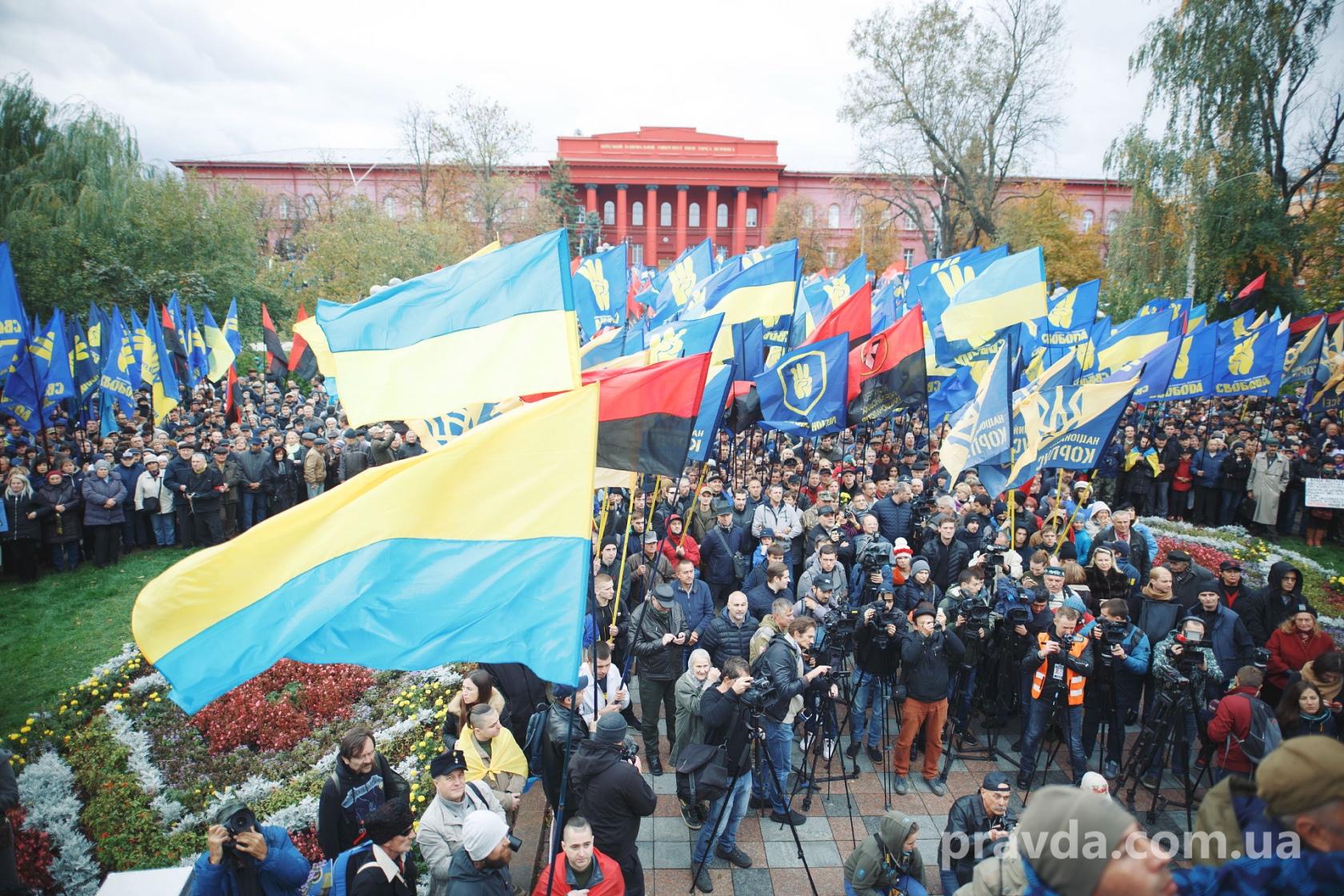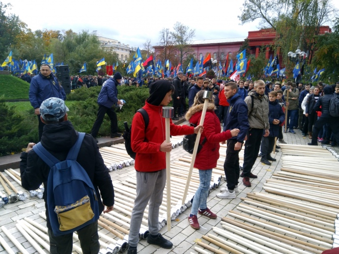 "Бандера – наш герой. Покрова – наш праздник", "Один язык – одна нация", "Авакова, собаку, повесим на гилляку", "Власть идиотов садит патриотов" – под такими лозунгами 14 октября прошел "Марш славы героев" в Киеве.