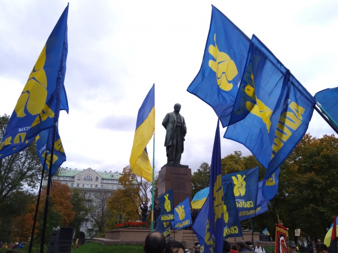 – У цьому році марш особливий, тут представники всіх націоналістичних та патріотичних сил – докладывает с постамента памятника Шевченко лидер "Свободы" Олег Тягнибок. – У березні ми підписали маніфест, тож тепер ми єдина сила, яку чекала країна.