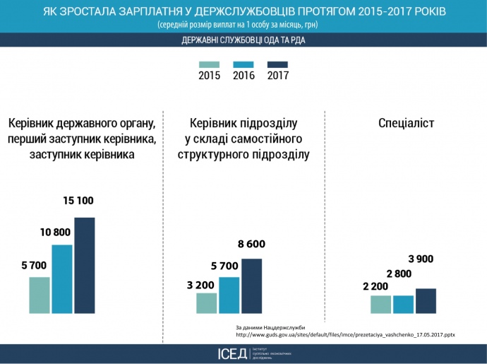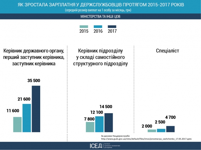 Сьогодні місячна заробітна плата керівника з 17-річним стажем роботи на держслужбі може становити 25 тисяч грн, натомість новоприйнятий працівник на посаді фахівця отримає 3 тисячі 200 грн, із яких 2 тисячі 200 грн – заробітна плата і 1000 грн – доплата до "мінімалки".
