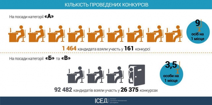 Для ілюстрації зрушень варто навести статистику станом на 31 березня 2017 року. Наприклад, за період дії закону 1464 кандидати взяли участь у 161 конкурсі на посади категорії "А" та 92 тисячі 482 осіб – у конкурсах на посади категорій "Б" та "В". У середньому по категорії "А" був конкурс 9 осіб на одне місце, а на посади категорій "Б" та "В" – 3,5 осіб.