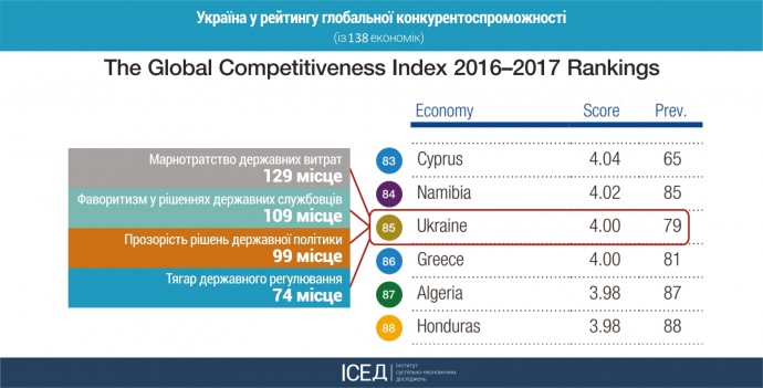 Так, у 2016 році Україна посіла 129 місце у рейтингу глобальної конкурентоспроможності за показником "Марнотратство державних витрат", 99 місце – за показником "Прозорість рішень державної політики", 74 місце – у рейтингу "Тягар державного регулювання" та 109 місце у рейтингу "Фаворитизм у рішеннях державних службовців".