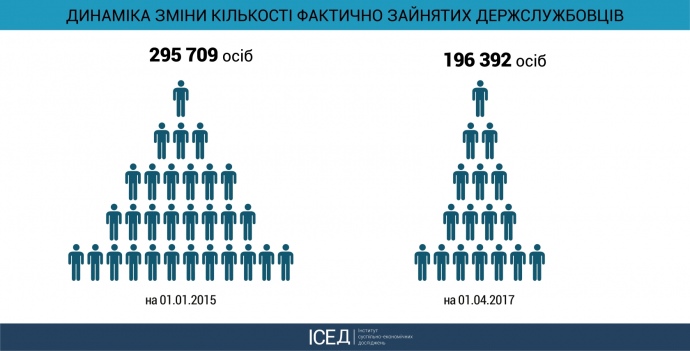 Станом на 1 січня 2015 року за даними Держстату в Україні працювало 295 тисяч 709 держслужбовців, проте вже за рік їхня кількість скоротилася приблизно до 250 тисяч. У квітні 2017 року кількість службовців була вже менше 200 тисяч. При цьому понад 30 тисяч посад були вакантними.