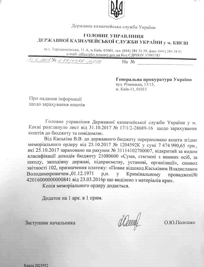 За тиждень до приїзду втікача, 25 жовтня 2017 року, сторона Каськіва передала Держказначейству 7,5 мільйонів, у розтраті яких підозрюють колишнього очільника Держінвестицій.