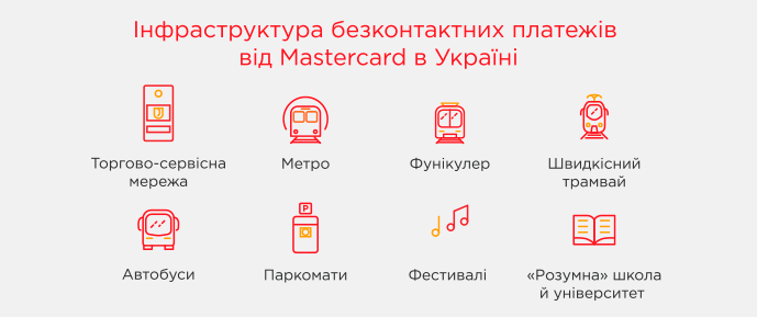 Інфраструктура безконтактних платежів в Україні постійно збільшується. Сьогодні це: і торгово-сервісна мережа, де, за оцінками експертів, вже понад 60% терміналів є безконтактними, і, завдяки Mastercard і партнерам, столичне метро, і фунікулер, і швидкісний трамвай у Києві, і автобуси, і паркомати, і фестивалі, і "розумна" безготівкова школа й незабаром перший "розумний" університет, і навіть вендингові апарати.