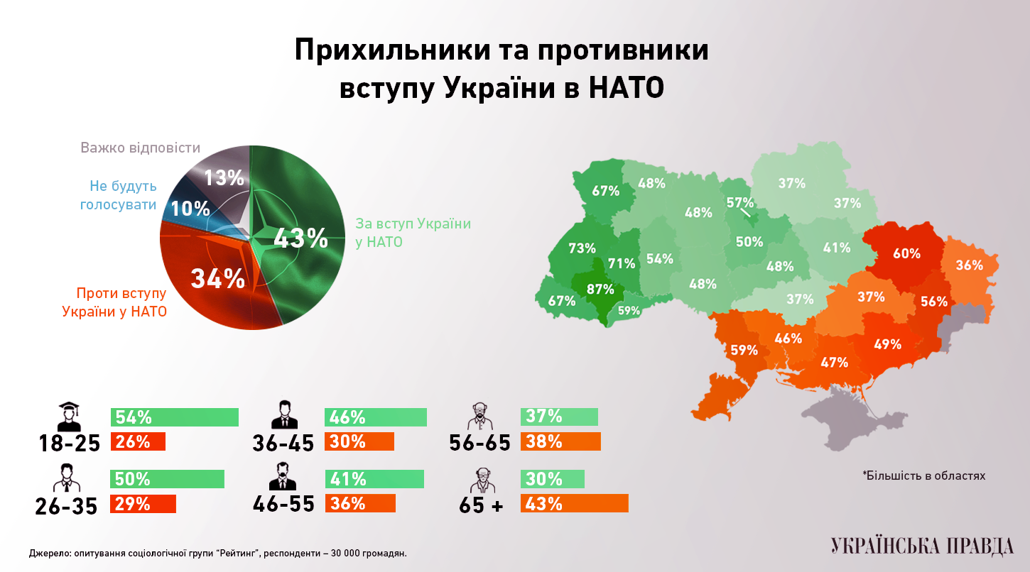 Днями Україна отримала статус "країни-аспіранта" у НАТО, що означає визнання прагнення стати членом альянсу. При цьому за останні три роки кількість українців, що підтримують вступ до НАТО, зросла у півтора рази . Зараз це 43% – майже половина населення країни.