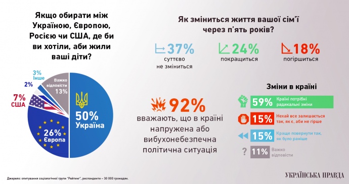 За таких настроїв не дивно, що лише половина населення хоче, щоб їхні діти жили в Україні, а кожен четвертий бачить свою дитину мешканцем Європи.