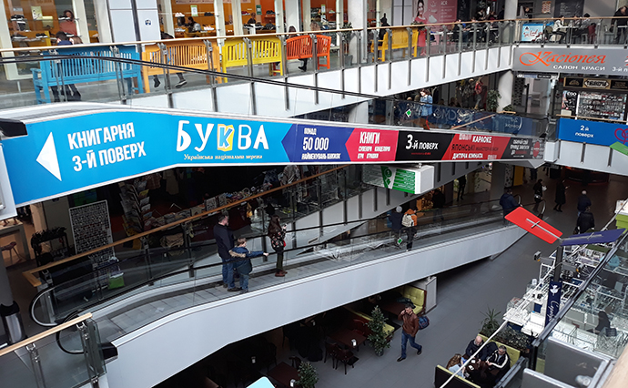 Після нетривалої бесіди з охороною й адміністрацією йдемо довгим залом третього поверху. Тут кав'ярні, льодовий майданчик, крамниці з іграшками та фастфуд. Через кожні кілька рядів у лівому та правому крилі – аварійні двері з відповідною табличкою з "зеленим чоловічком" та написом "вихід". Усі відчинені, не захаращені.