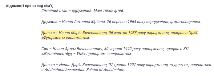 На офіційній сторінці депутата навіть вказано, що його донька працює в компанії, яка виграє тендери, — ПрАТ "Фундамент", а син — у компанії-замовнику "Житлоінвестбуд-УКБ".