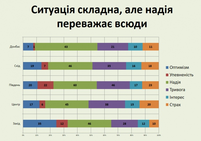 Цікаві дані по регіонам. Надія переважає всюди. Оптимізму явно більше на Заході, а найменше – на Донбасі. Проте й страху на Донбасі вдвічі менше, ніж на Сході й у Центрі!