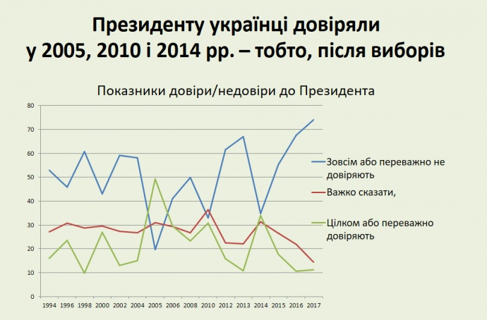 Що стосується довіри до президента. Тут закономірність дуже проста: після виборів довіряємо, через рік довіра починає падати, падати і падати. Наступному президенту спочатку довіряємо, потім довіра знов починає падати, падати і падати.