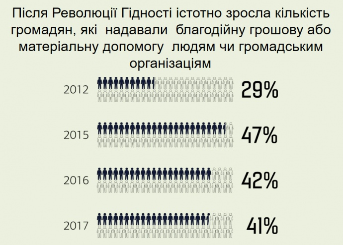 Позитив – бачимо, що після Революції Гідності істотно зросла кількість громадян, які надавали благодійну грошову або матеріальну допомогу людям чи громадським організаціям. Правда, суми, які давали, невеликі. Але якщо порахувати кількість людей, які гроші давали (40% населення!), то виходить, що суми досить значні.