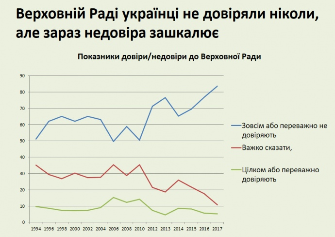Верховна Рада взагалі поза конкуренцією, що стосується рівня недовіри. І це дуже сумно, тому що Верховну Раду ми обираємо, і Верховна Рада є основним законодавчим органом в Україні. Цікаво, коли ми питали після виборів, як ви вважаєте, чи правильний вибір ви зробили, відповідають, "так"; а чи довіряєте ви Верховній Раді – "ні". Одразу після виборів. Отака цікава ситуація.