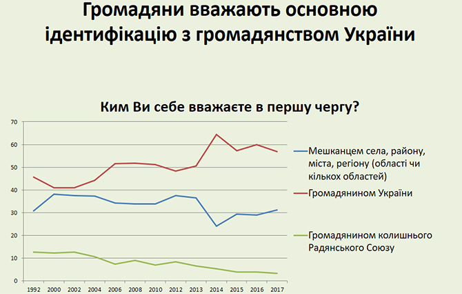 Ми бачимо, що зросла ідентифікація з громадянством України. Питання ставилося так: "Ким ви вважаєте себе в першу чергу?" Або в першу чергу – громадянином України, або в першу чергу – жителем свого міста, свого села, свого регіону. І ми бачимо, що зменшилася регіональна ідентифікація, і зросла ідентифікація загальнонаціональна.