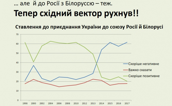 Після трагічних подій – анексії Росією Криму та збройної російської агресії східний вектор зовнішньополітичних орієнтацій різко впав, хоча далеко не всі з тих, хто раніше підтримував орієнтацію на союз з Росією, стали прихильниками євроінтеграції. У більшості вони зараз перейшли в категорію або "важко сказати", або "нікуди нам не треба приєднуватися".