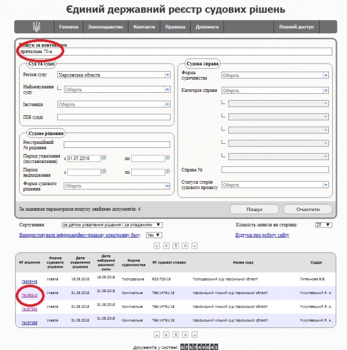 Якщо ввести в пошук адресу "Причальна 70-А", за якою живе Павловський, то реєстр ще донедавна видавав три ухвали у справі Гандзюк.