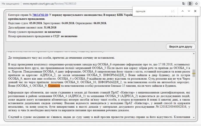 На сайті Єдиного державного реєстру судових рішень у судовій ухвалі по справі Гандзюк від 31 серпня можна було прочитати прізвище якогось "Одинцова".