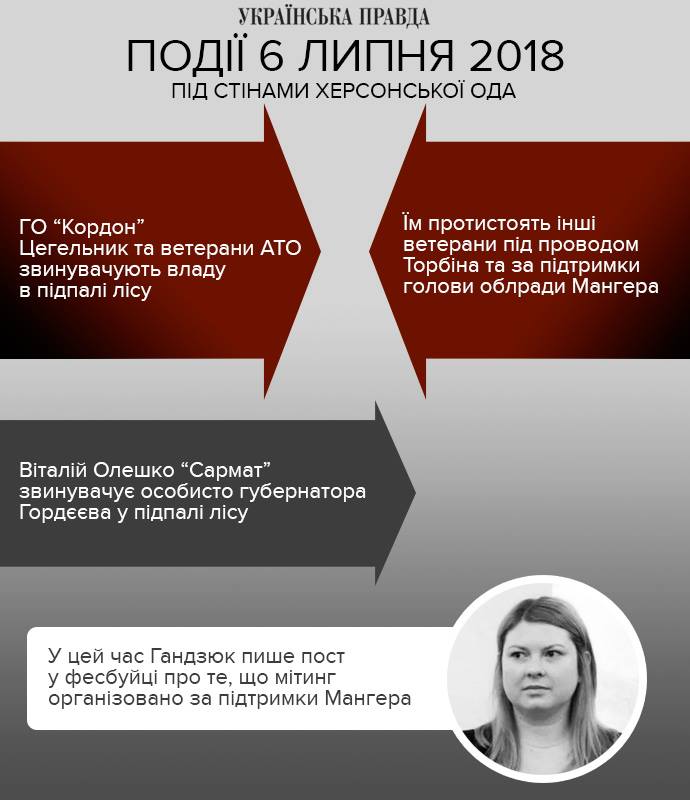 "Голова Херсонської облдержадміністрації виконує доручення голови обласної ради від Батьківщини та помічника титульного сєпара Олексія Журавка Владислава Мангера розібратись з мітингом, який привертає зайву увагу до незаконної вирубки лісів всіма сторонами цього, простигосподи, конфлікту", – написала Гандзюк.