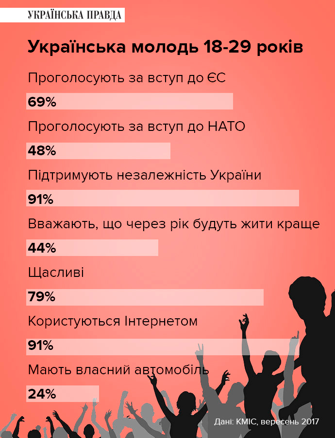 Попри це різниця між молоддю і іншими показує, що країна досить впевнено рухається у європейському напрямку, 70% молоді підтримує інтеграцію з ЄС. 80% молоді є людьми щасливими, вони вже живуть в інформаційному суспільстві – більше 90% користуються Інтернетом.