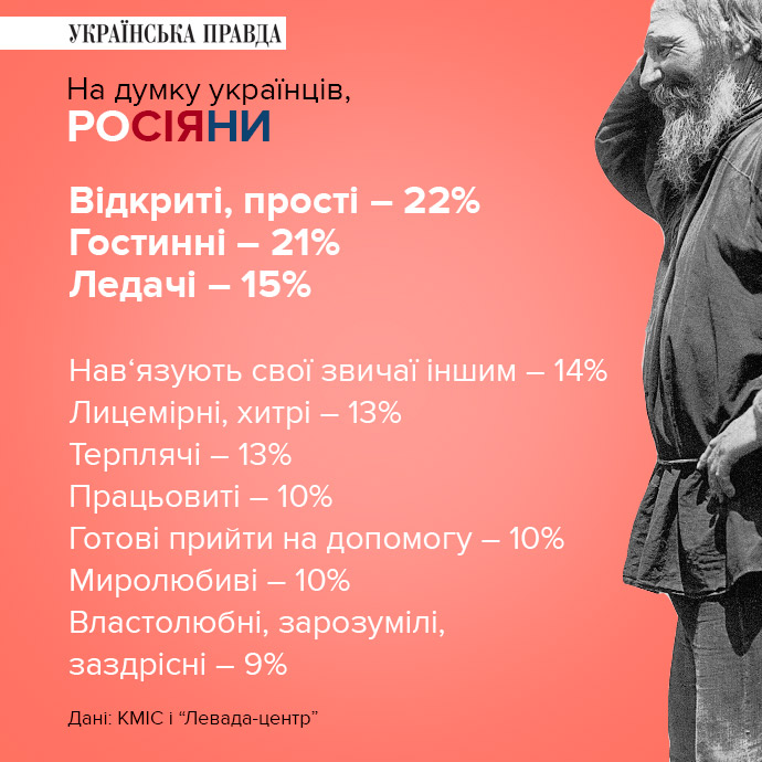 Але дані показують, що це – переважно ставлення до населення Росії. Адже до керівництва позитивно ставиться лише 8%. Мені здається, що одне з пояснень цьому – це дійсно якісь риси українського національного характеру, але досліджень про це немає.